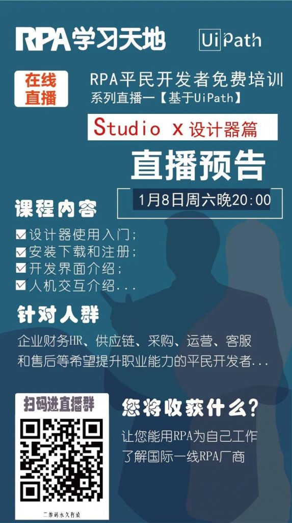 1月8日周六晚20:00, RPA平民开发者免费培训直播 (UiPath Studio X)欢迎您参加!