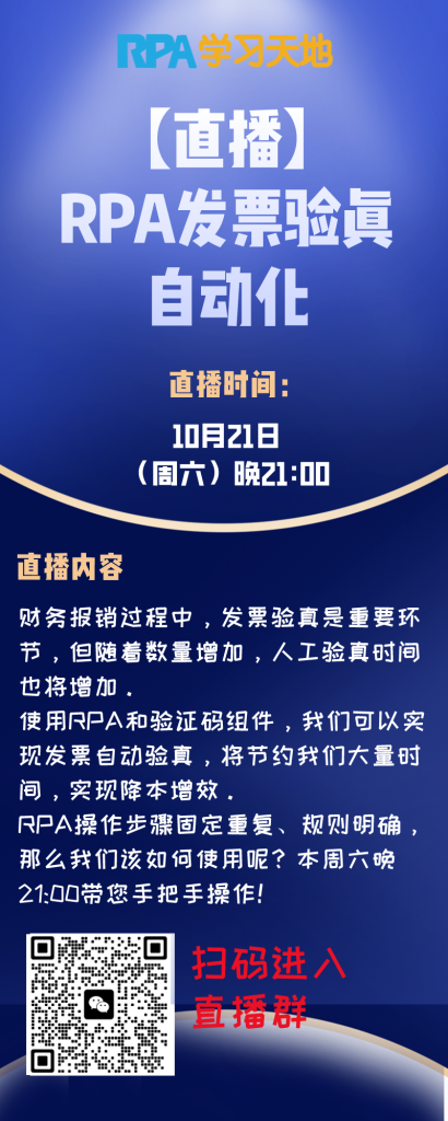 【RPA直播:10月21日周六晚21:00】发票验真自动化