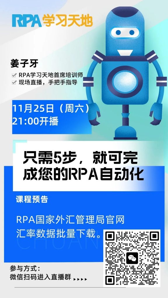 【RPA直播:11月25日周六晚21:00】五步完成您的自动化(外汇管理局数据批量下载)