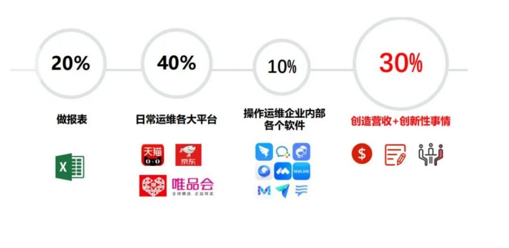 以电商领域的财务岗位为例,财务工作人员70%的时间都在处理报表、日常运维各大电商平台及操作运维企业内部各个软件这些工作,仅有30%的时间做创造营收和创新性工作。