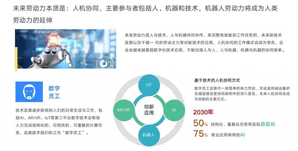 未来劳动力本质是:人机协同,主要参与者包括人、机器和技术,机器人劳动力将成为人类劳动力的延伸。