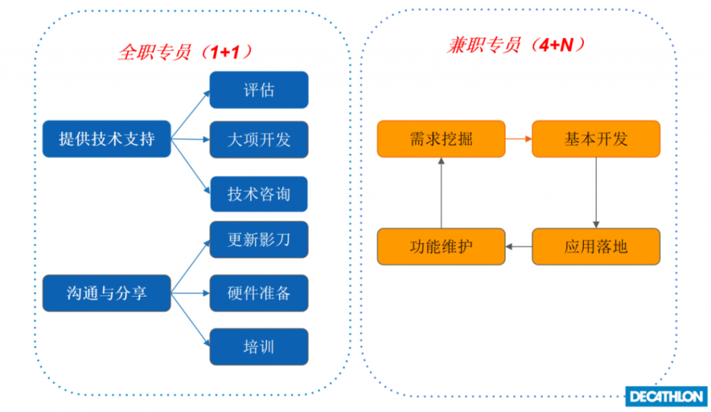 迪卡侬是全职+兼职打法,2名专职和4+N兼职的团队架构。专职更多负责深度开发挖掘、培训等工作,而兼职更多地是需求挖掘、基本开发、去落地、去维护。
