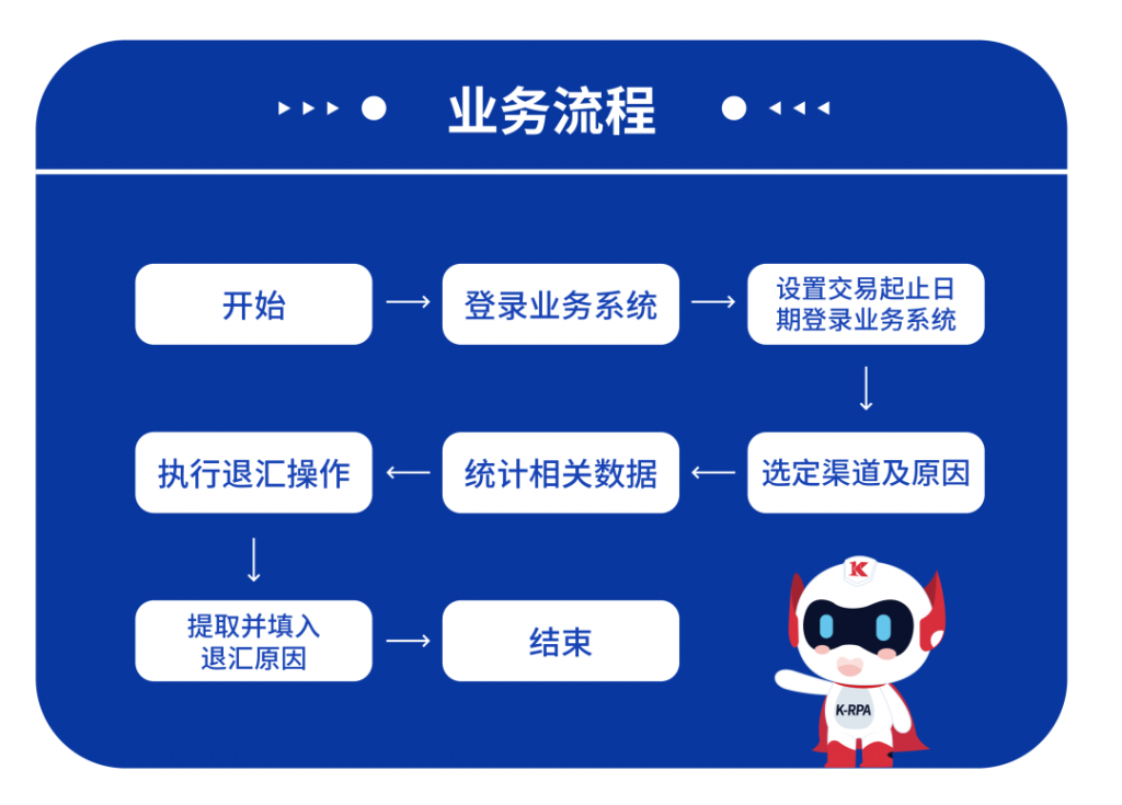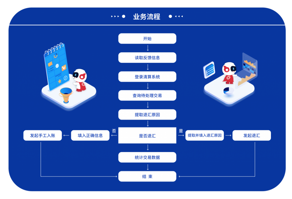 来账挂账处理包括业务系统挂账交易自动化处理、清算系统挂账交易自动化处理两个业务流程。业务系统挂账交易自动化处理对跨行区分大、小额类型来账挂账,指定不同的挂账原因进行自动批量退汇处理。在系统中进行自动批量退汇处理,自动区分挂账原因并进行批量退汇,最后需要补充填入相关的退汇原因,并计入统计报表。/业务痛点1.业务流程执行频率高2.对业务处理时效性要求高3.涉及线上线下两个不同的重复繁琐流程4.需要在系统内不同界面重复繁琐的切换操作/业务流程