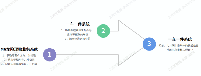 业务员处理理赔业务时,需要人工对车损进行审核。业务员首先需要在业务系统中记录车损的相关数据信息;再登录一车一件系统,手动将多个相关数据逐个复制到系统中进行查询,并记录、汇总查询结果;最后比对两个系统中的数据差异,反馈给业务员查看。