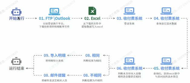 现通过部署RPA机器人后,实现整个流程实现全自动化,步骤及说明: