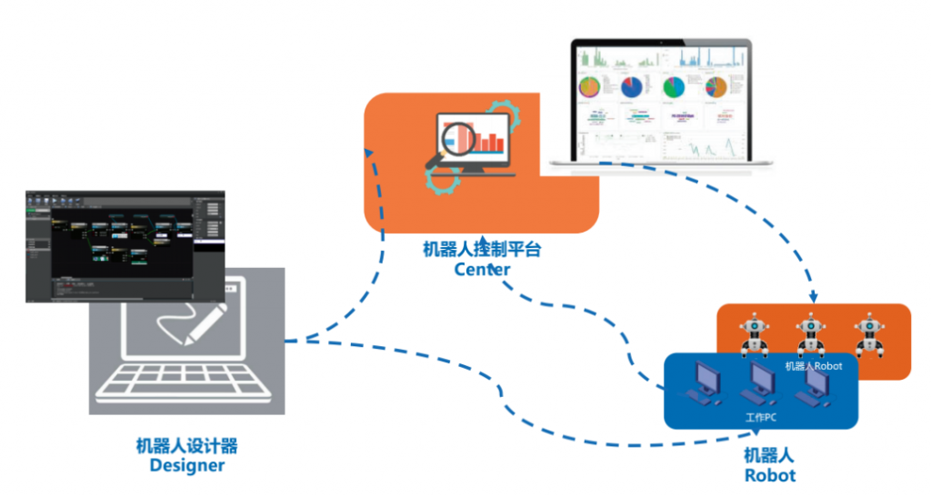RPA(Robotic Process Automation机器人流程自动化,以下简称:RPA机器人),即以机器人作为虚拟劳动力,让计算机学习和模仿人类处理任务的步骤,模拟人对计算机的操作,无需更改原有IT系统,代替人完成重复性的业务操作,实现端到端的流程自动化。整体解决方案通常由场景设计平台、机器人控制平台、运行机器人三部分组成,机器人可单独使用,也可结合控制平台与其他机器人联动(见图1)。