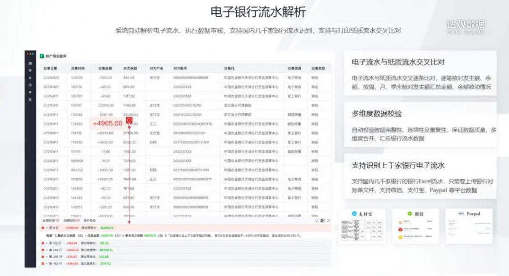 达观银行流水审核系统利用深度学习OCR技术,能够精准识别并解析60多家主流银行的流水版式。系统支持包括微信和支付宝在内的多种流水格式,通过高效的图像预处理技术,自动消除印章、水印等干扰,保证了数据提取的完整性和准确性。这一过程不仅简化了数据处理流程,还大幅减少了前期的工作量,实现了真正意义上的智能流水审核。