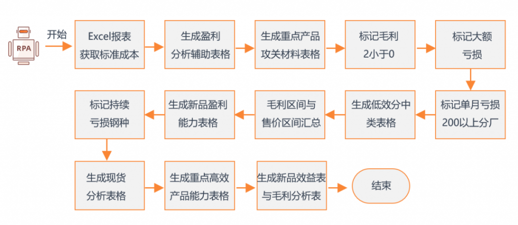 在产品盈利分析报告流程中,Cyclone RPA自动执行该业务流程要点包括: